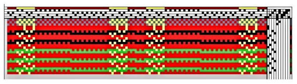 The project is woven using 2 shuttles. 8/2 Red cotton weaves the background. The base of the corduroy tree is woven using 6 strands of black 8/2 cotton and metallic yarns. The green corduroy “trees” are woven using 6 strands of green 8/2 cotton and metallic yarns. This draft weaves both sides of the bag at once. Between each “bag” I wove 1.5 inches of tabby, for cutting and sewing allowance.