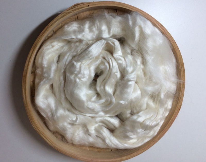 Rose fibre is best spun with a medium to tight twist. The yarn can be used as a single ply or plied with itself or another fibre. The single ply is also lovely when used as weft in handwoven fabrics. Rose fiber can also be used in wet or needle felting, doll hair and paper making.